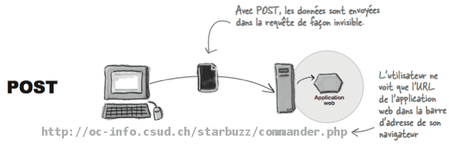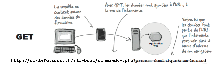 Pour envoyer des données au serveur, les navigateurs utilisent deux méthodes: POST et GET. La première méthode, POST, empaquette les variables du formulaire et les envoie discrètement au serveur, alors que la deuxième, GET, les ajoute à la fin de l'URL dans la barre d'adresse du navigateur au moment d'envoyer la requête au serveur.