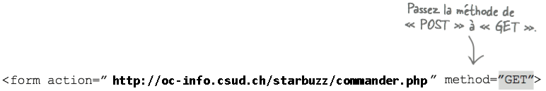 Le meilleur moyen de comprendre ce que fait la méthode GET est de la voir en pleine action. Ouvrez le fichier formulaire.html et effectuez le changement suivant puis enregistrez le fichier et actualisez la page. Vous remplirez ensuite le formulaire et le soumettrez au serveur. Observez l'URL: