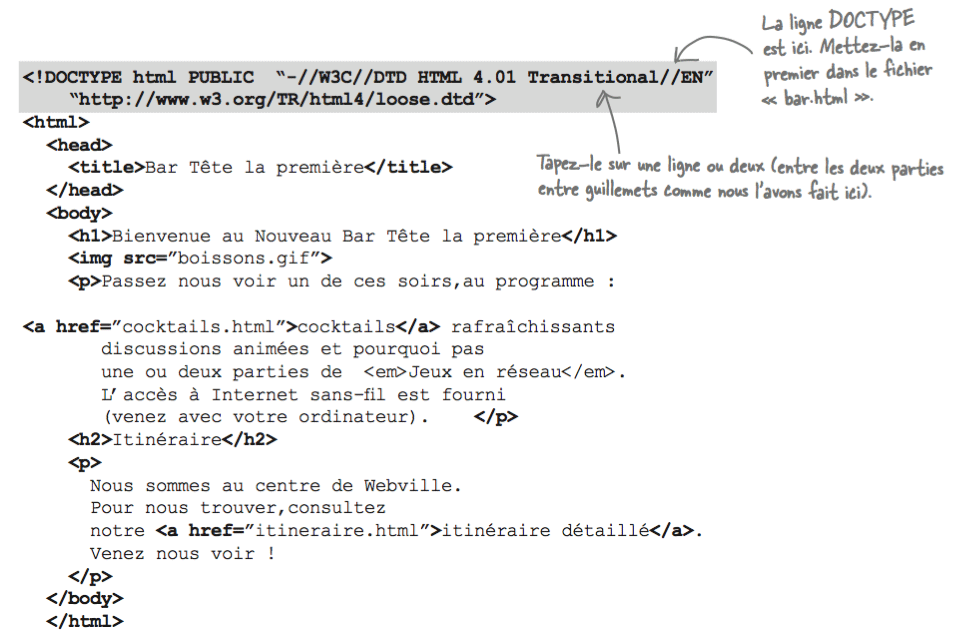 Ajoutez la déclaration du type de document ci-dessus aux fichiers du site du Bar Tête la Première puis chargez-les dans votre navigateur et observez.