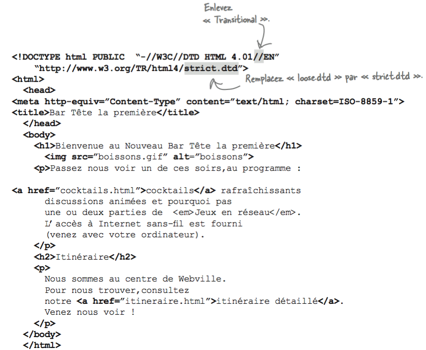 Il existe deux types de documents pour le HTML 4.01: l'un transitoire et l'autre strict. La DTD HTML 4.01 Transitoire autorise l'utilisation d'anciennes versions de HTML alors que le HTML 4.01 Strict est parfaitement conforme aux standards du Web. Pour passer du HTML 4.01 transitoire au strict, il suffit de changer la DTD: