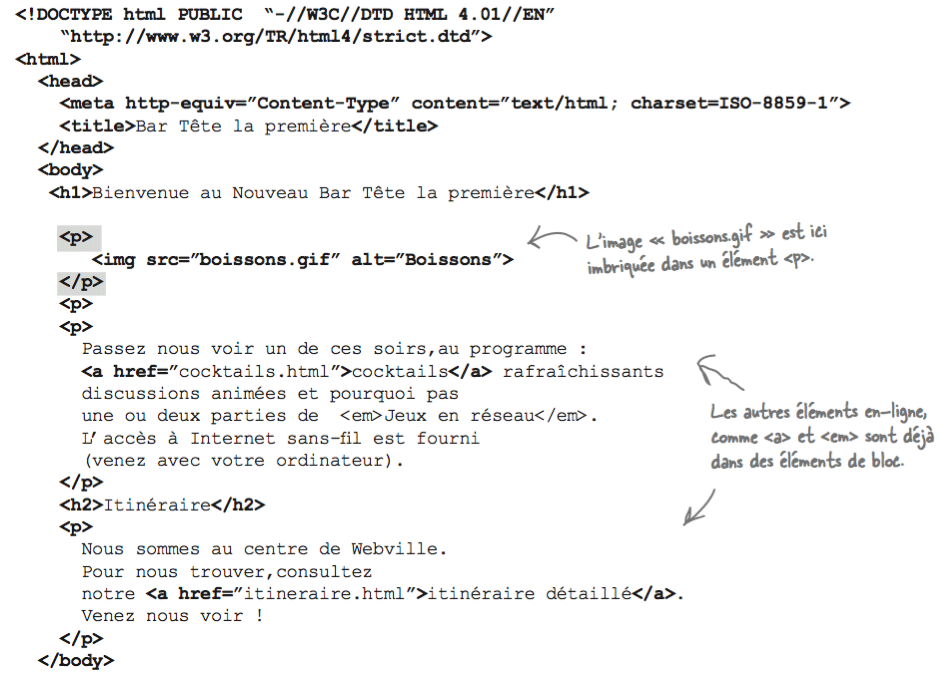 Le HTML 4.01 Strict préfère que les images, qui sont des éléments en-ligne, soient imbriquées dans un élément de type bloc, comme un paragraphe ou un titre. Pour corriger l'erreur soulevée ci-dessus, il suffit donc d'insérer un élément <p> autour de l'élément <img>. Cet ajout n'affectera pas l'allure visuelle de la page car le titre situé au-dessus de l'image et le paragraphe en-dessous sont déjà des éléments de type bloc avec sauts de ligne au-dessus et au-dessous. Il permettra néanmoins de valider le fichier au standard HTML 4.01 Strict.